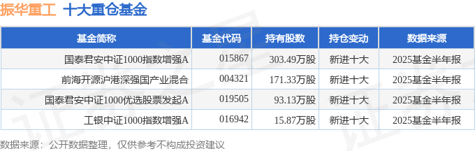 持有振华重工最多的基金为国泰君安中证1000指数增强A,目前规模为7.86亿元,最新净值1.4365(8月29日),较上一交易日下跌0.32%,近一年上涨82.71%。该基金现任基金经理为胡崇海刘晟。